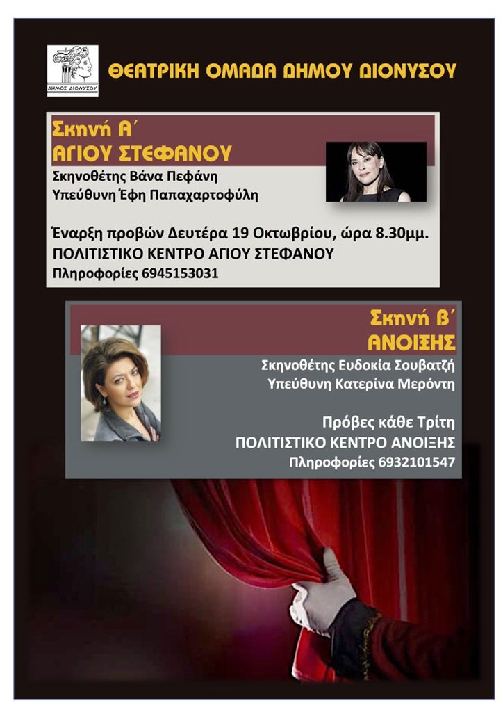 Δύο δημοτικές θεατρικές ομάδες θα λειτουργήσουν μέσα στις επόμενες ημέρες υπό την αιγίδα του Δήμου Διονύσου, δίνοντας την ευκαιρία σε νέους ηθοποιούς κάθε ηλικίας να δοκιμάσουν τις ικανότητες αλλά και να καλλιεργήσουν το ταλέντο τους, με την καθοδήγηση καταξιωμένων ηθοποιών-σκηνοθετών.
